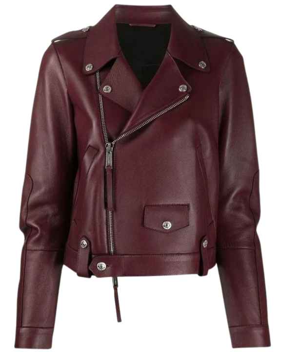 เสื้อแจ็คเก็ตมอเตอร์ไซค์หนังเทียมสีเบอร์กันดีสำหรับผู้หญิง ทรงเข้ารูป ซิปแบบนักขี่มอเตอร์ไซค์ ปกคลาสสิก แฟชั่นเสื้อคลุม