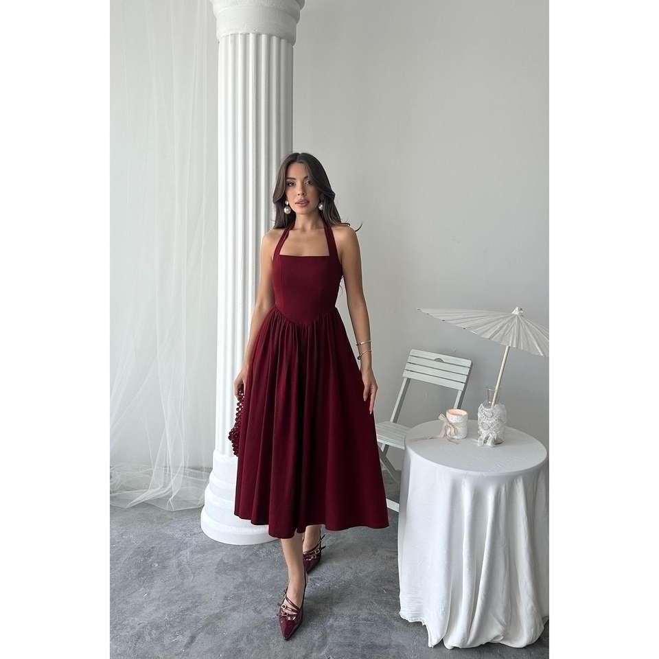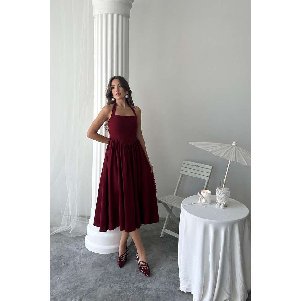 ชุดเดรสผ้าลินินสีเบอร์กันดี คอแบบผูก สายเดี่ยว ทรงเอ ไลน์ เอวธรรมชาติ ระบายอากาศได้ดี เหมาะสำหรับงานกลางคืน