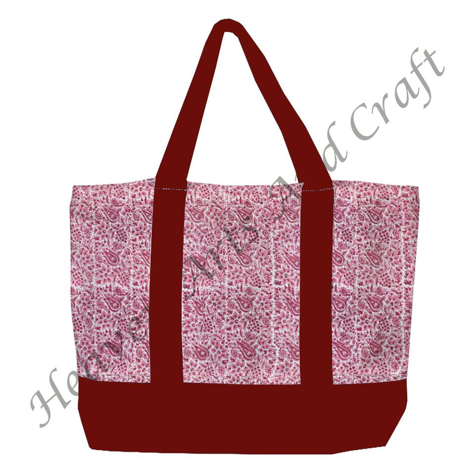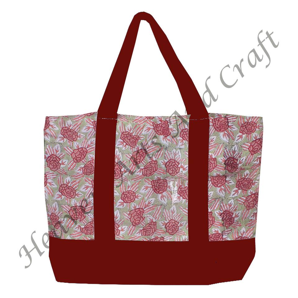 กระเป๋าโท้ทลายดอกไม้พิมพ์บล็อกแบบอินเดีย หูหิ้วสีเบอร์กันดี ทนทาน มีสายสะพายสองเส้น ขายส่ง BHCB121