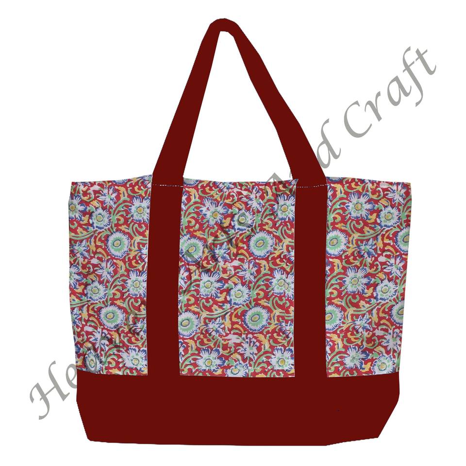 กระเป๋าโท้ทลายพิมพ์บล็อกสีเบอร์กันดี ผลิตในอินเดีย ลายดอกไม้แบบหลายมือ ดีไซน์ทนทาน สายสะพายไหล่สองเส้น ขายส่ง BHCB055