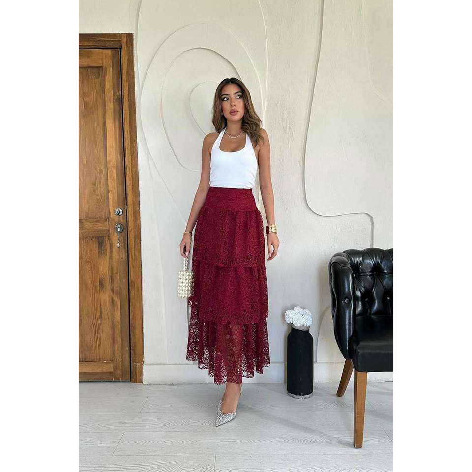 กระโปรงลูกไม้เบอร์กันดีทรงหลายชั้น เอวสูง ผ้าเนื้อนุ่มสำหรับผู้หญิง กระโปรงยาวปานกลาง