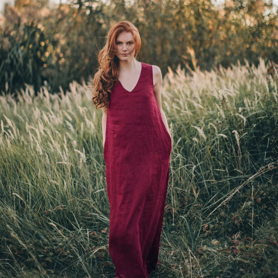 Product Name:Linen Burgundy Maxi Dress