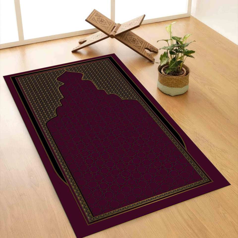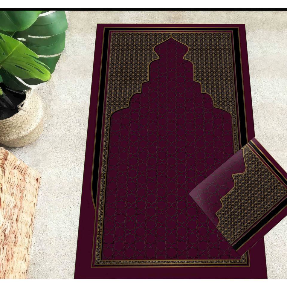 พรมสวดมนต์เบอร์กันดี: พรมบูชาอิสลามลายสำเนียงทองพรมพิมพ์ลายพร้อมพรมเนื้อนุ่ม