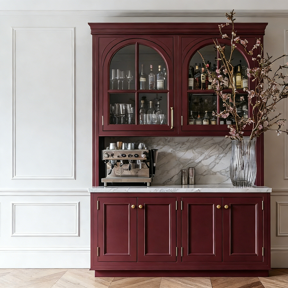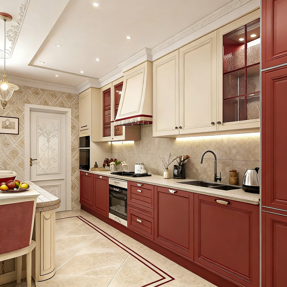 ตู้ครัวสีแดงเบอร์กันดี - สไตล์หรูหราแบบเรโทร ไม้เนื้อแข็ง + ท็อปเคาน์เตอร์หิน ตู้ครัวปรับแต่งได้