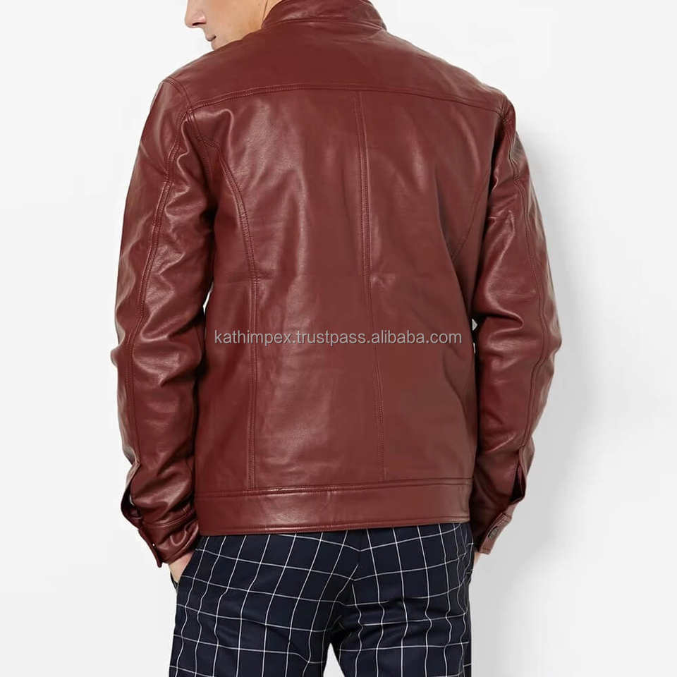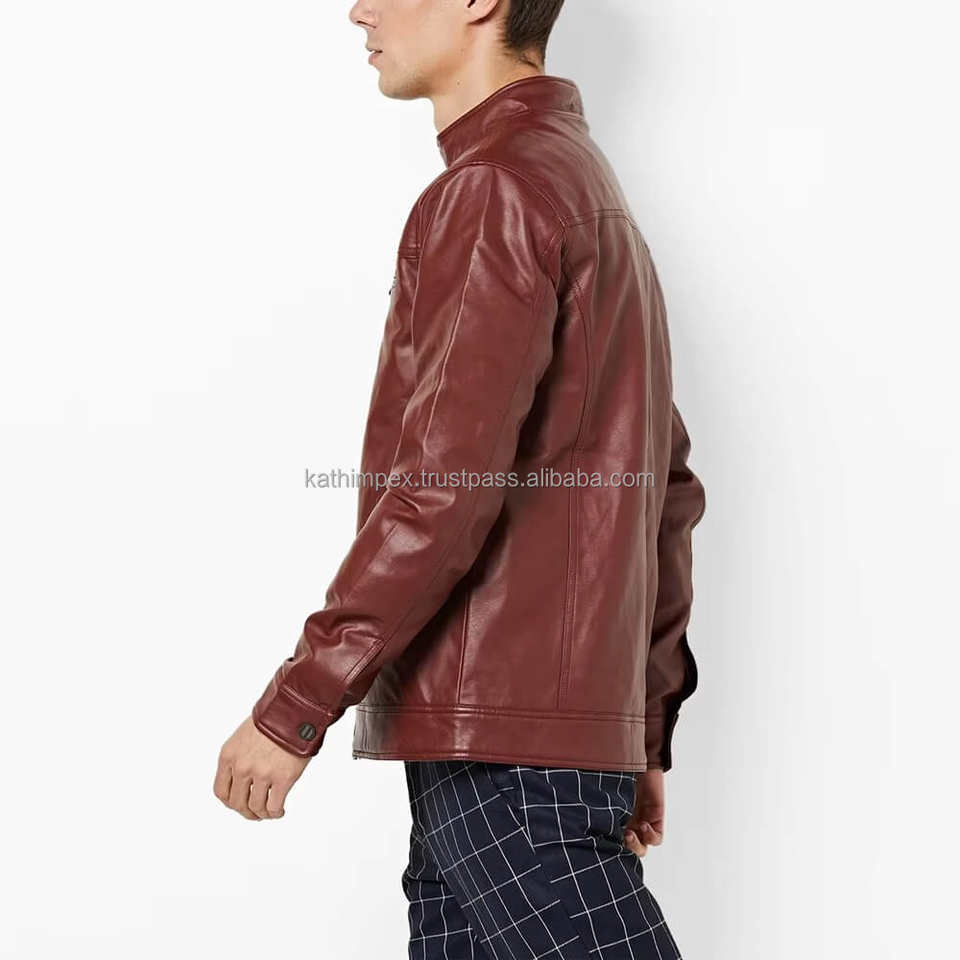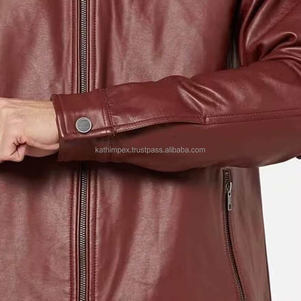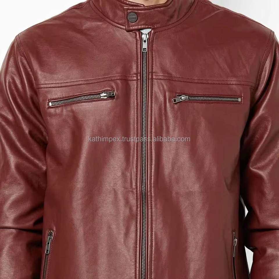 แจ็กเก็ตหนังพอดีตัวสำหรับผู้ชายเบอร์กันดีมีปกตั้งและมีกระเป๋าซิปเหมาะสำหรับเสื้อผ้าลำลองแบบสมาร์ท
