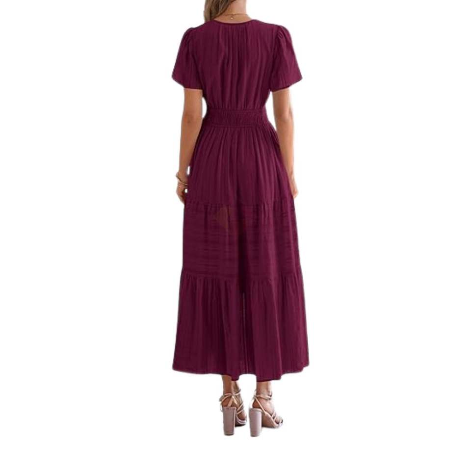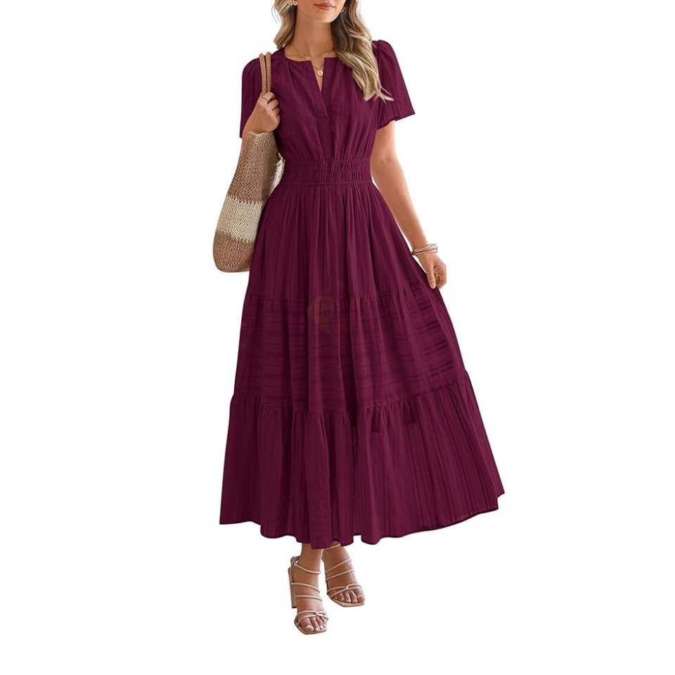 เดรสยาวทรงเอไลน์สีเบอร์กันดี แขนสั้น สไตล์โบฮีเมียน สำหรับฤดูร้อน แต่งระบายจีบ ผ้าคอตตอนผสม เสื้อผ้าสตรี รับผลิตแบบ OEM