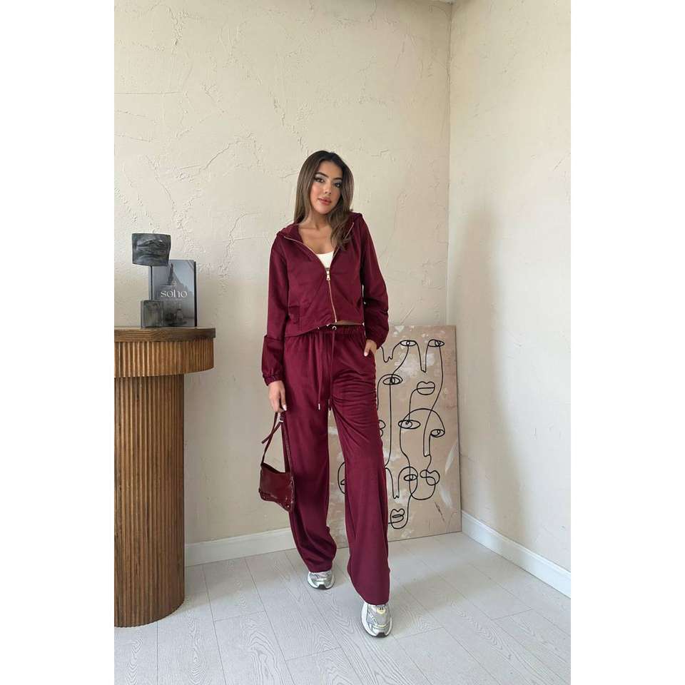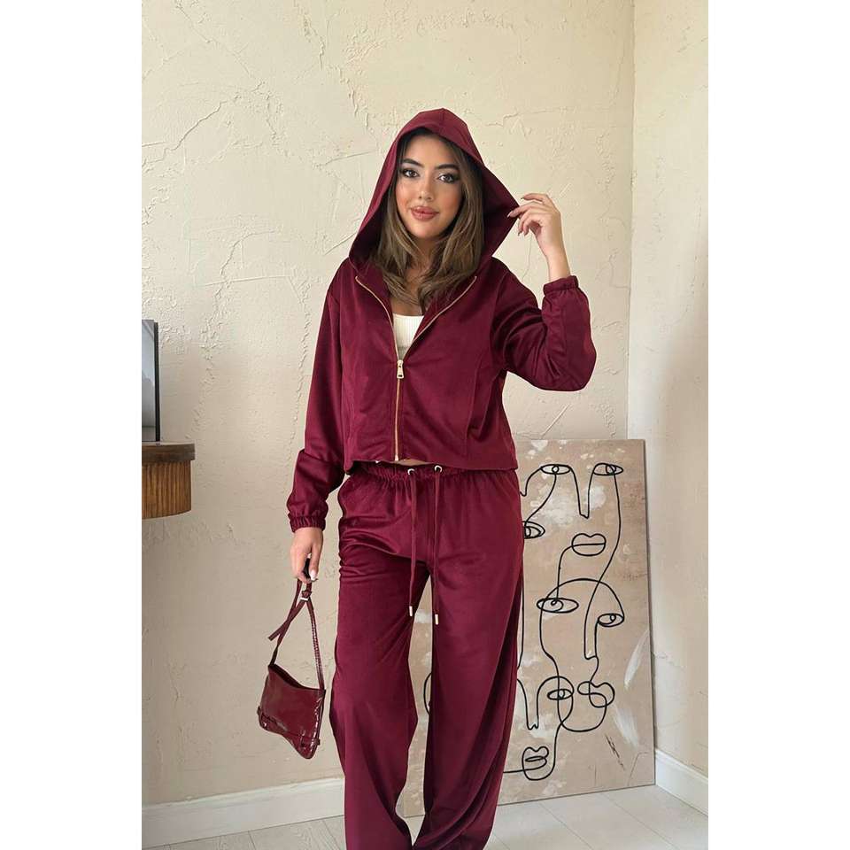 ชุดวอร์มกำมะหยี่สีเบอร์กันดีสำหรับผู้หญิง แขนยาว ดีไซน์เรียบง่าย ไซส์ผู้ใหญ่