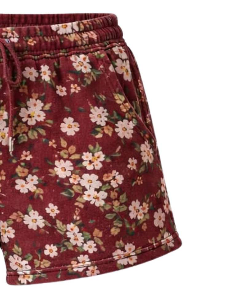 กางเกงขาสั้นผ้าฟลีซพิมพ์ลายดอกไม้สีแดงเบอร์กันดีสำหรับผู้หญิง เอวยางยืด สวมใส่สบาย เหมาะสำหรับฤดูร้อน รับผลิตตามสั่ง OEM ขายส่ง คุณภาพส่งออก