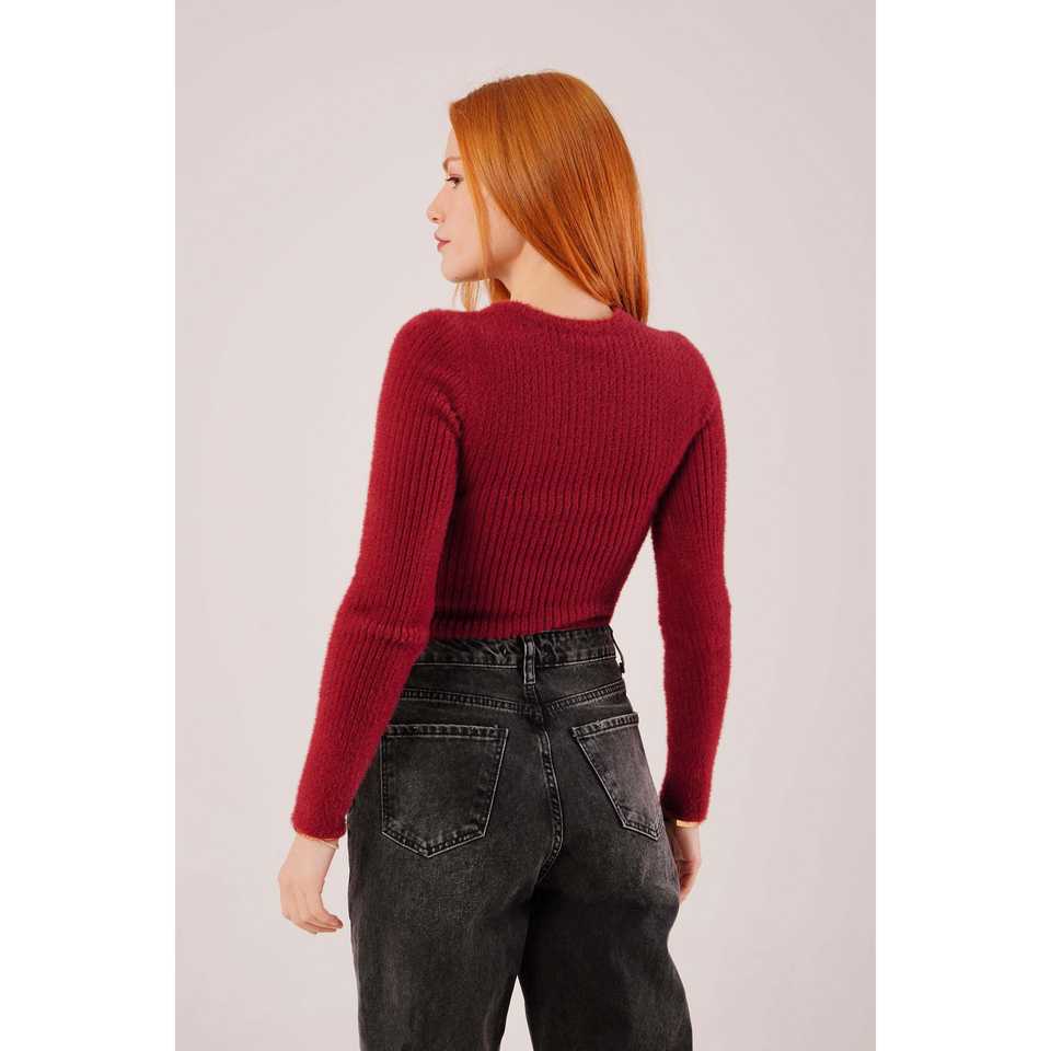 เสื้อสเวตเตอร์คอกลมแขนยาวสำหรับผู้หญิงสีเบอร์กันดี ผ้าถักแบบลำลอง ป้องกันการเกิดขุย
