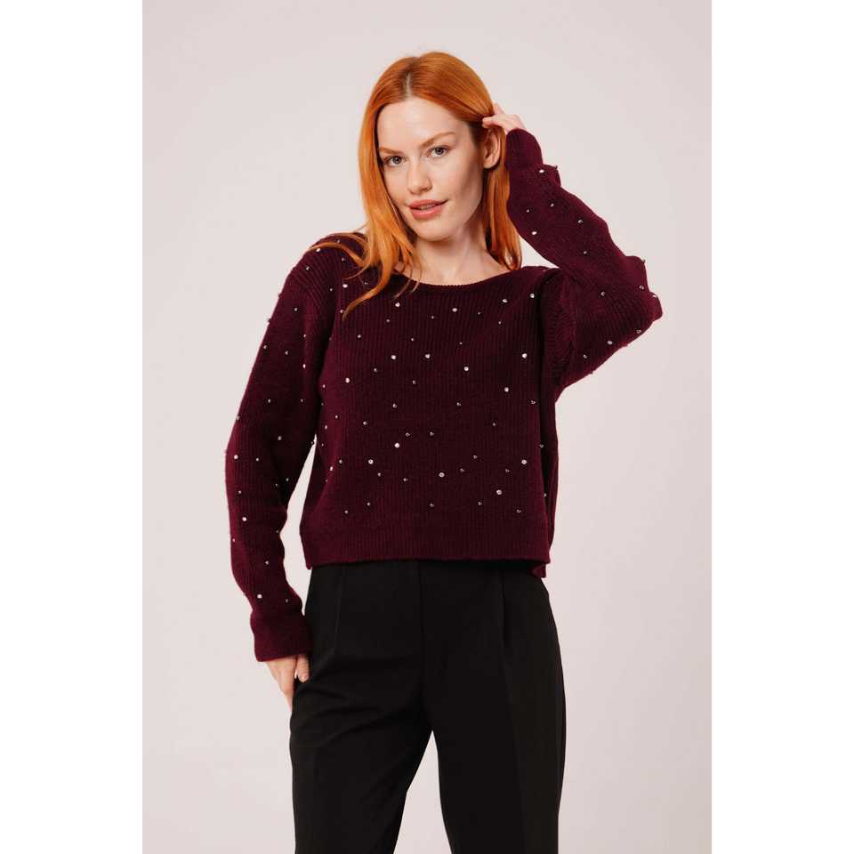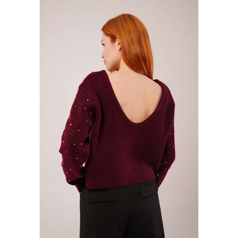 เสื้อสเวตเตอร์ผู้หญิงสีเบอร์กันดี แขนยาว ประดับด้วยหิน ดีไซน์เปิดหลัง สไตล์หรูหรา
