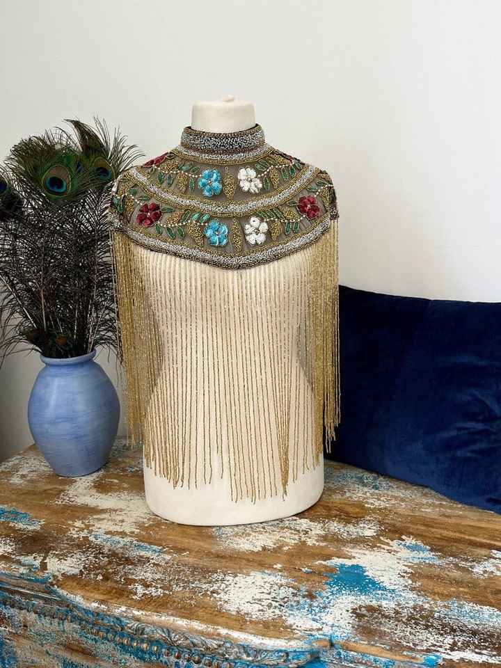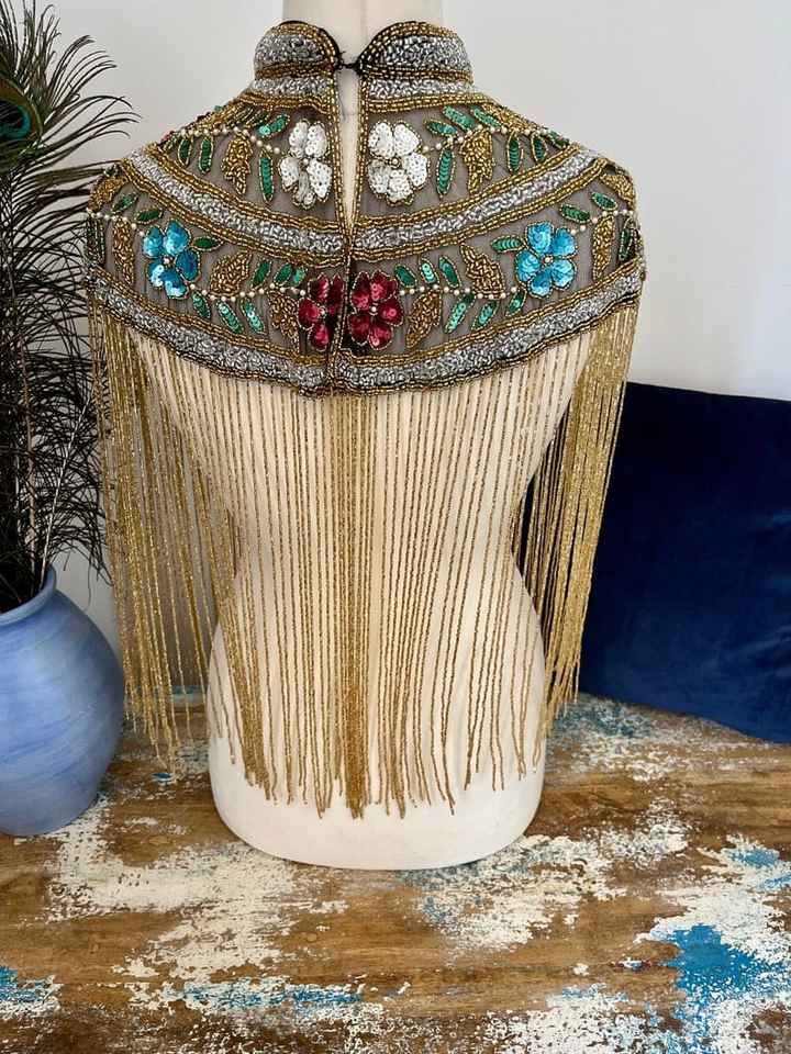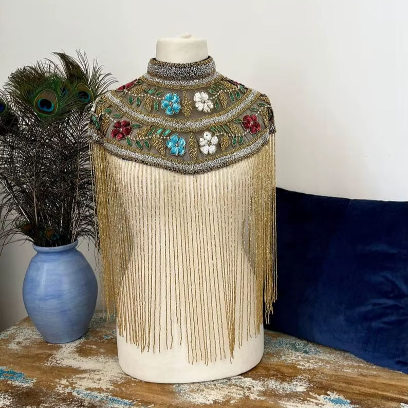 Burlesque Cape with Beaded Strands and Sequins Fastens at Neck Beautiful Festive Wrap in Straight Silhouette Festival Capes