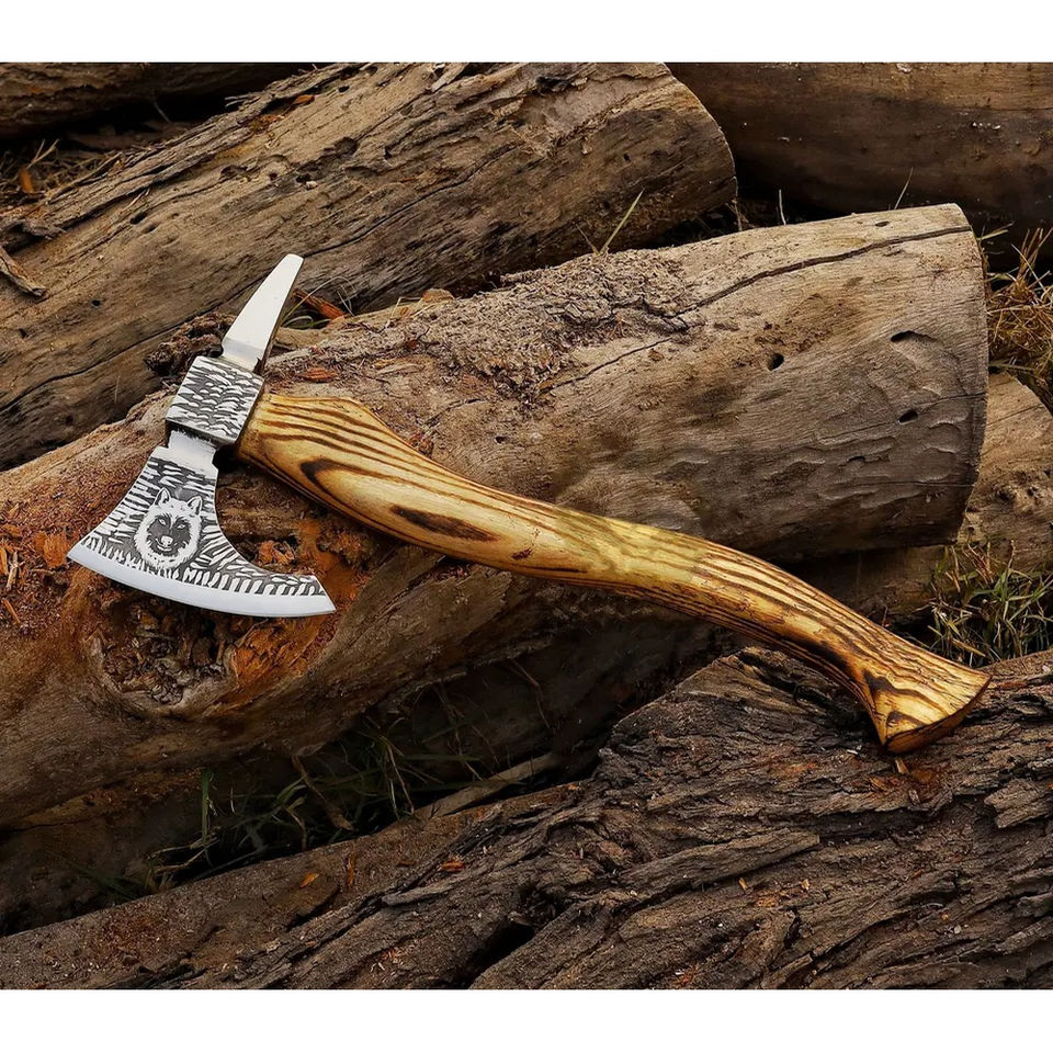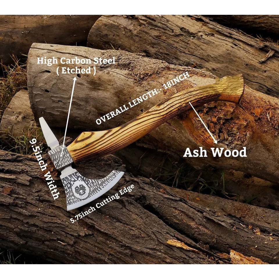 ขวานตัดไม้ Burraq ขนาด 18 นิ้ว ทำมือจากเหล็กกล้าคาร์บอน ด้ามไม้พะยูง หุ้มหนัง พร้อมใบมีดสำหรับล่าสัตว์ ตั้งแคมป์ และกิจกรรมกลางแจ้ง