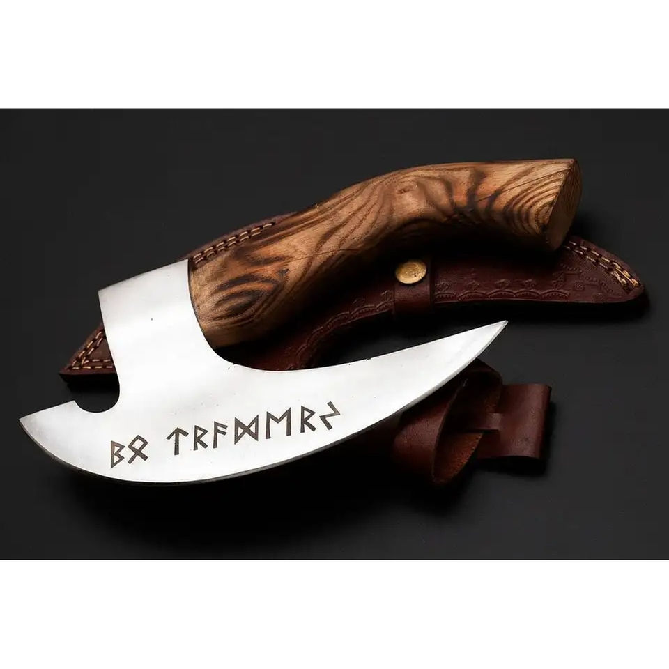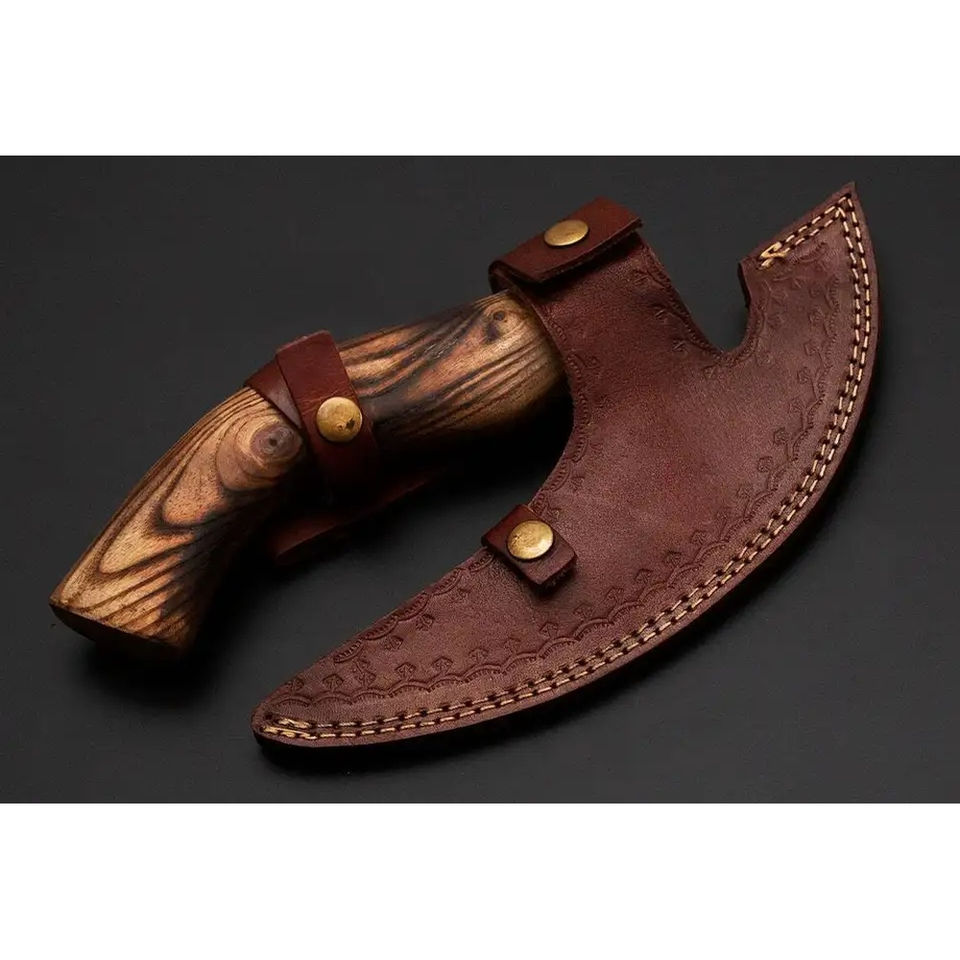 มีดตัดพิซซ่าเหล็กกล้าคาร์บอนทำมือ Burraq ด้ามไม้พะยูง ปลอกหนัง สำหรับแคมป์ปิ้ง กิจกรรมกลางแจ้ง DIY อุตสาหกรรม ของขวัญวันพ่อ