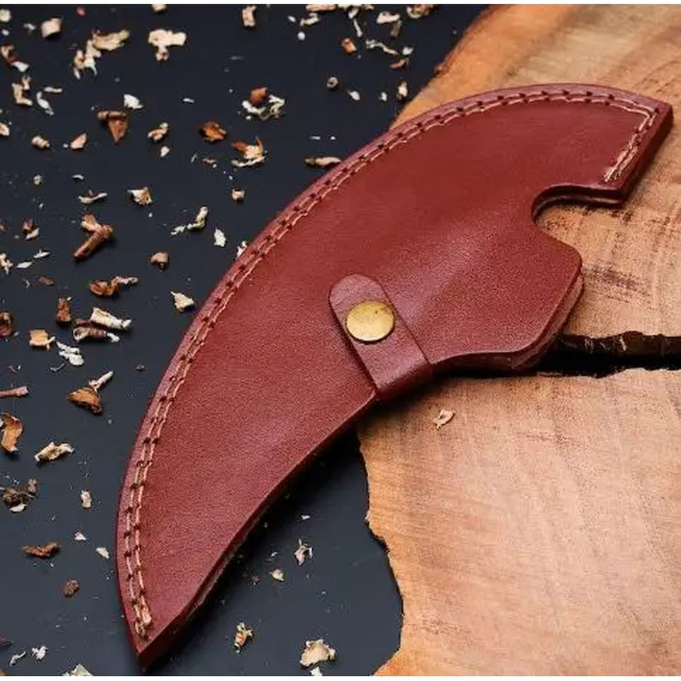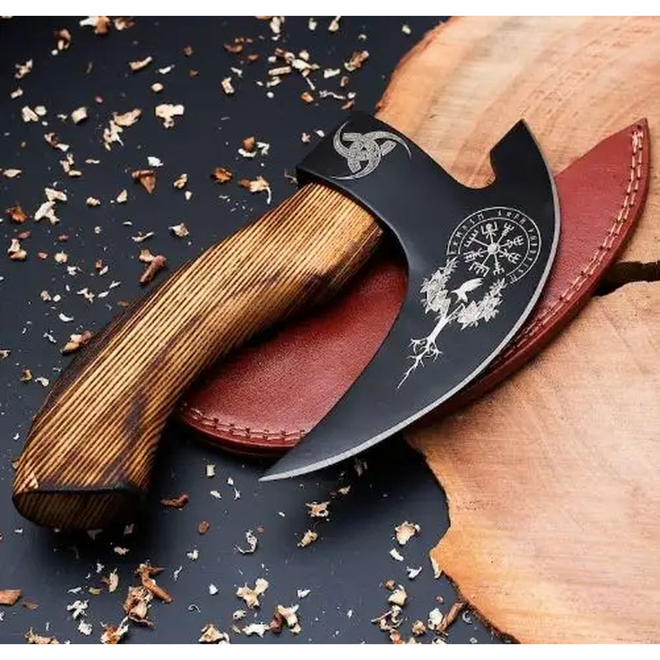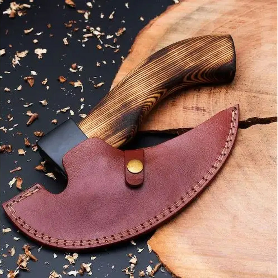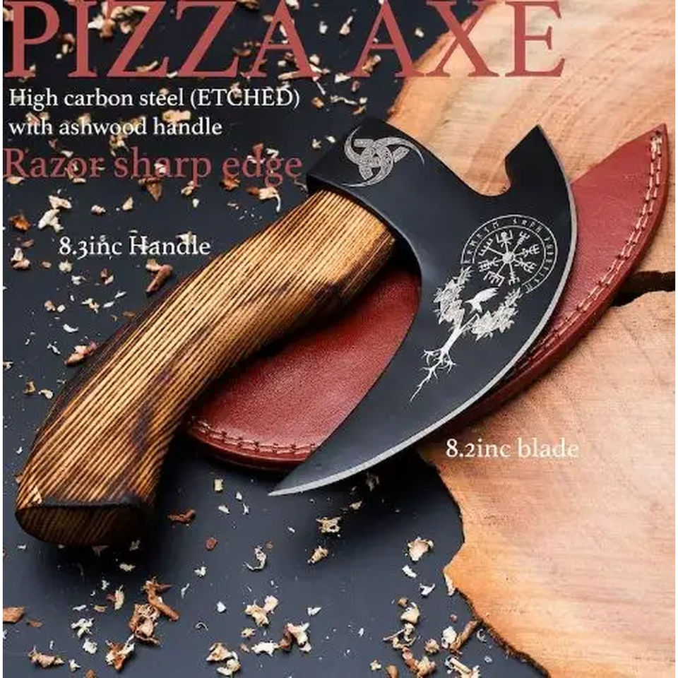 ขวานพิซซ่า Burraq ทำมือจากเหล็กกล้าคาร์บอนเกรดอุตสาหกรรม ด้ามไม้พะยูง พร้อมปลอกหนัง ขนาด 8.3 นิ้ว สำหรับแคมป์ปิ้ง