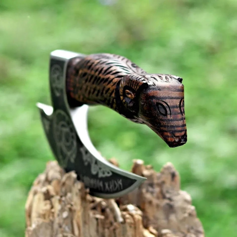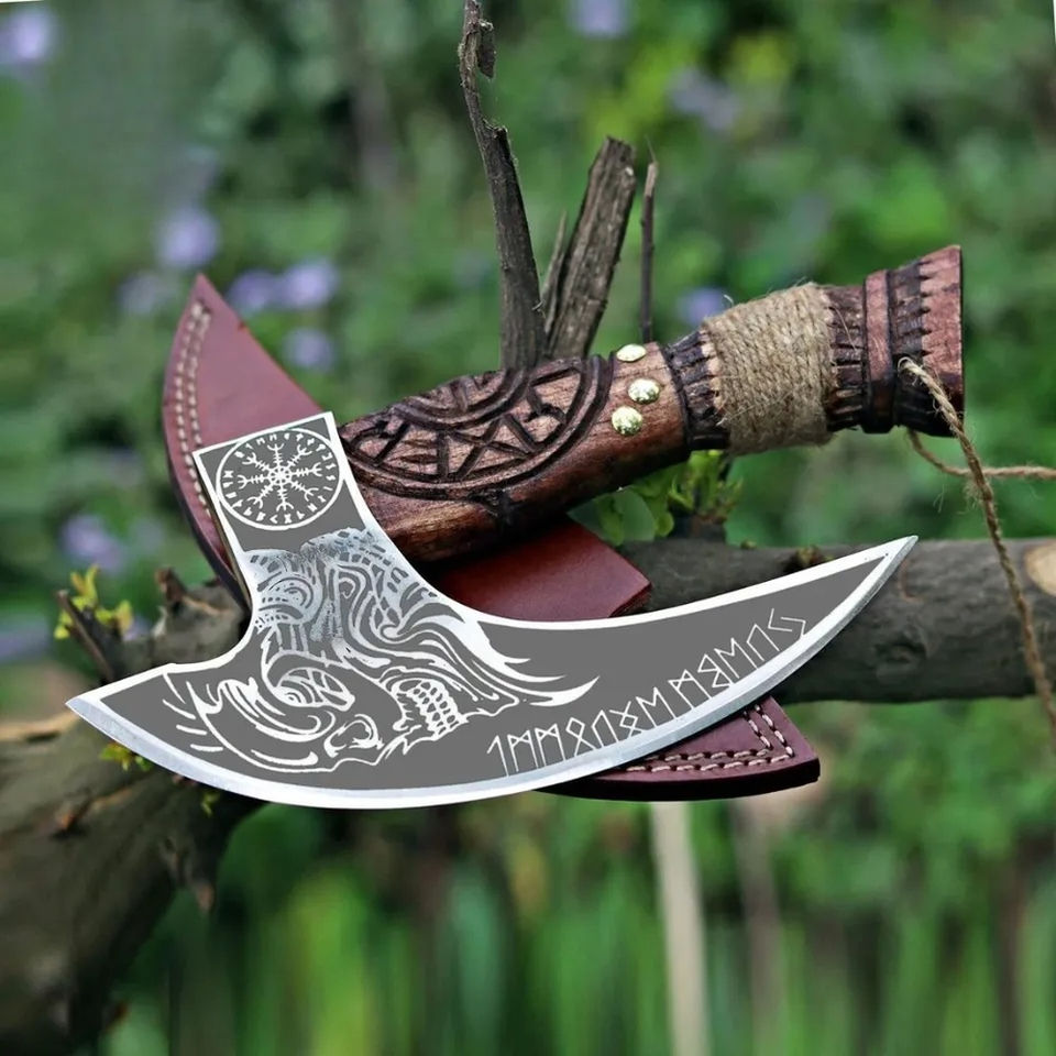 มีดตัดพิซซ่าเหล็กกล้าคาร์บอนทำมือ Burraq ขนาด 10 นิ้ว ด้ามไม้พะยูง พร้อมปลอกหนัง สำหรับงาน DIY อุปกรณ์อุตสาหกรรม ทอมฮอว์ก และแคมป์ปิ้ง