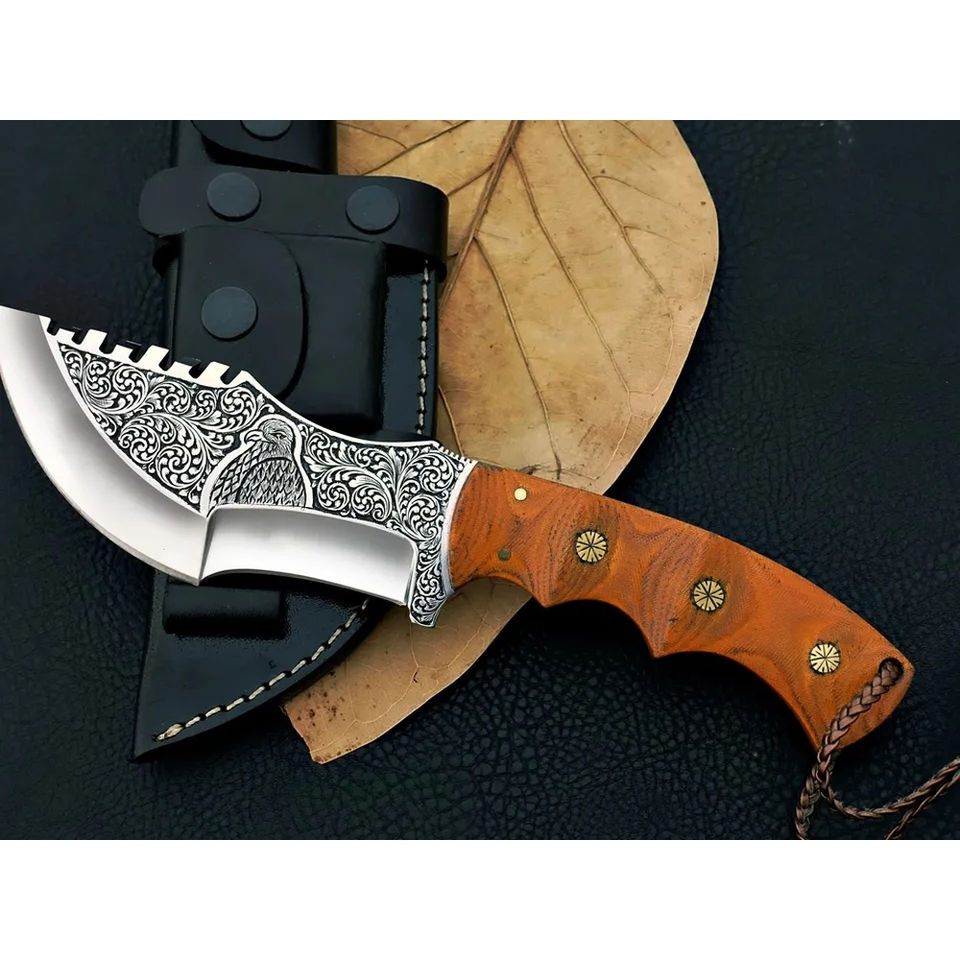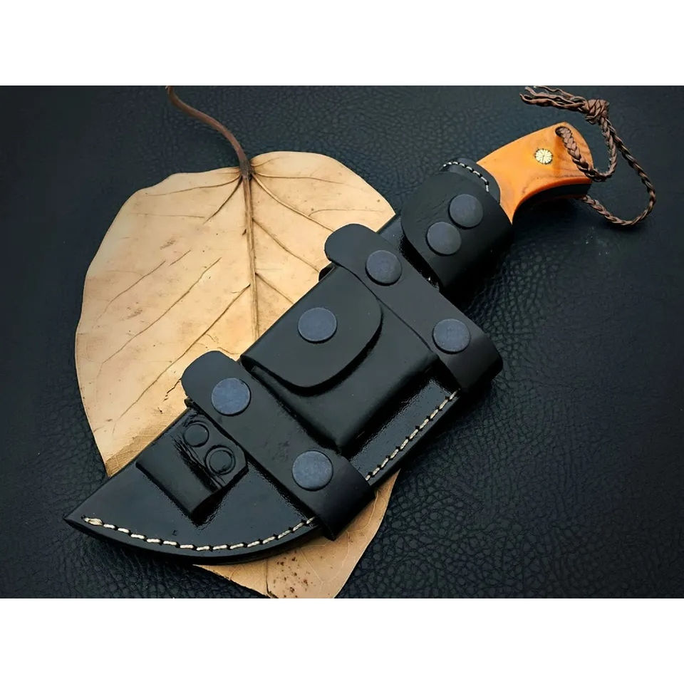 มีดแทรคเกอร์ Burraq แบบกำหนดเอง DIY OEM ทำมือจากเหล็ก D2 ลายตอกแบบ Full Tang พร้อมปลอกหนัง ขนาด 12 นิ้ว ของขวัญวันครบรอบ