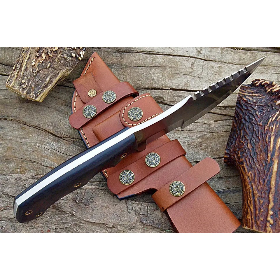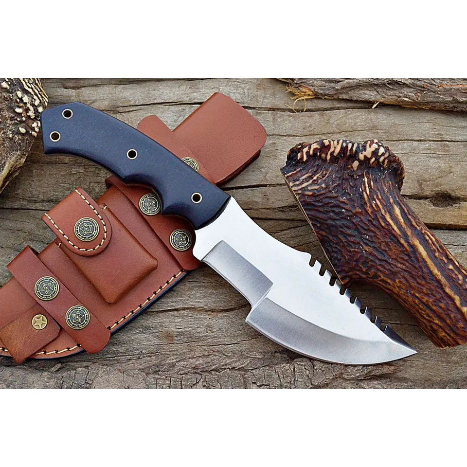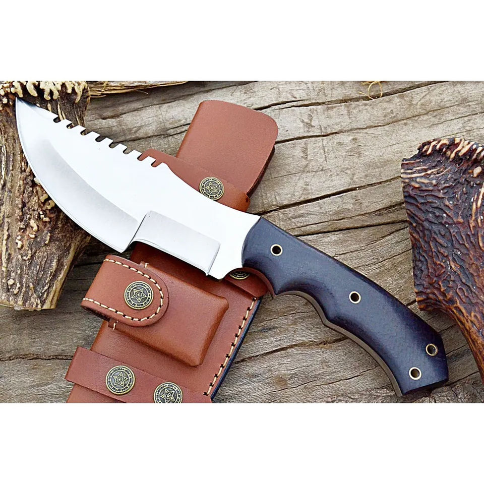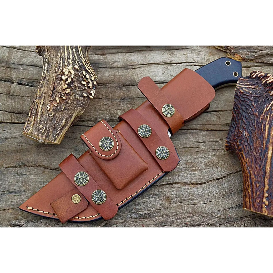 มีดแทรคเกอร์เหล็กดามัสกัสทำมือแบบเต็มด้าม Burraq DIY ขนาด 12 นิ้ว พร้อมปลอกหนังไมคาร์ต้า ของขวัญครบรอบ OEM สำหรับกิจกรรมกลางแจ้ง