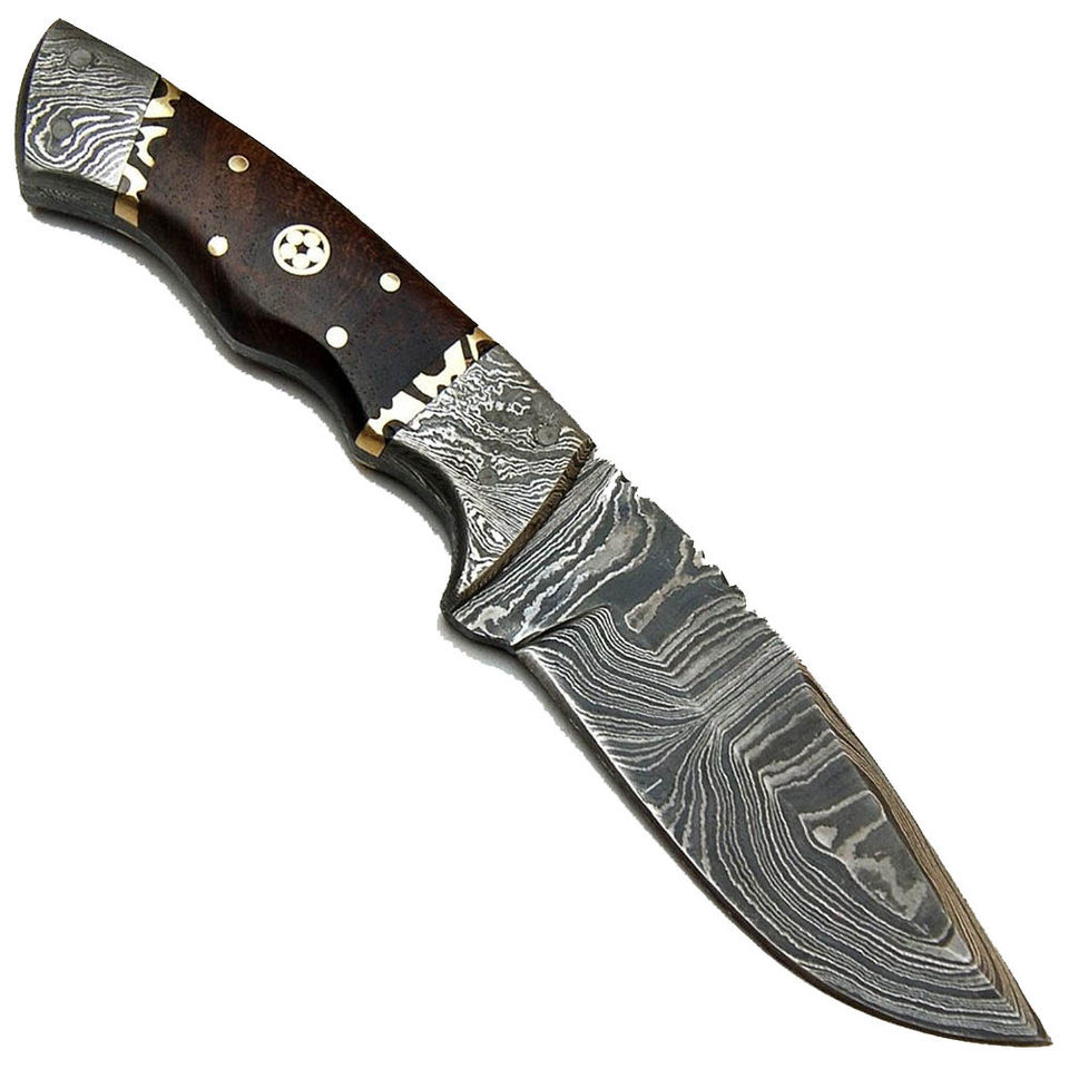 มีดสกินเนอร์เหล็กดามัสกัสทำมือแบบสั่งทำพิเศษของ Burraq ด้ามไม้ ปลอกหนัง ขนาด 9 นิ้ว หนา 2 มม. สำหรับตั้งแคมป์ ล่าสัตว์ DIY OEM