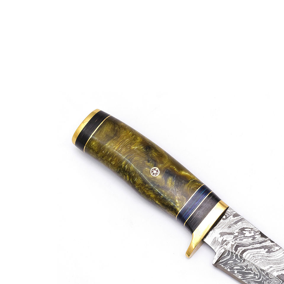 มีดสกินเนอร์เหล็กดามัสกัสทำมือแบบสั่งทำพิเศษของ Burraq ด้ามเรซิ่น ปลอกหนัง ขนาด 9 นิ้ว หนา 2 มม. สำหรับตั้งแคมป์ ล่าสัตว์ DIY OEM