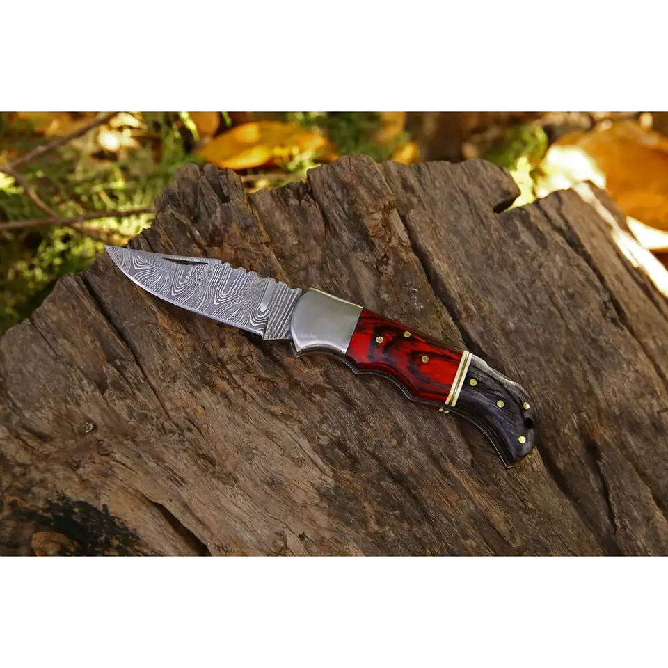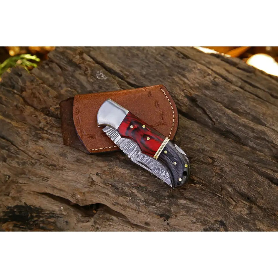 มีดพับ Burraq DIY แบบกำหนดเอง OEM ผลิตด้วยมือจากเหล็กดามัสกัสอเนกประสงค์ ขนาด 8 นิ้ว แบบเปิดด้านหลัง/ปุ่มหมุนเปิด พร้อมด้ามไม้