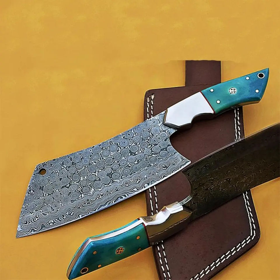 มีดเชฟเหล็กดามัสกัสทำมือ Burraq DIY OEM ลายหยดน้ำอเนกประสงค์ พร้อมปลอกหนัง ขนาด 10 นิ้ว หนา 2 มม.