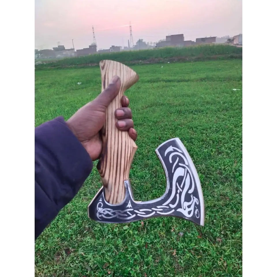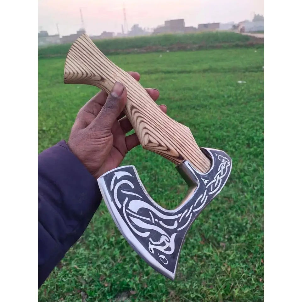 ขวานพิซซ่าเหล็กกล้าคาร์บอนทำมือแบบกำหนดเองจาก Burraq Industrial ด้ามไม้โรสวูด ปลอกหนัง ขนาด 10 นิ้ว สำหรับตั้งแคมป์กลางแจ้ง
