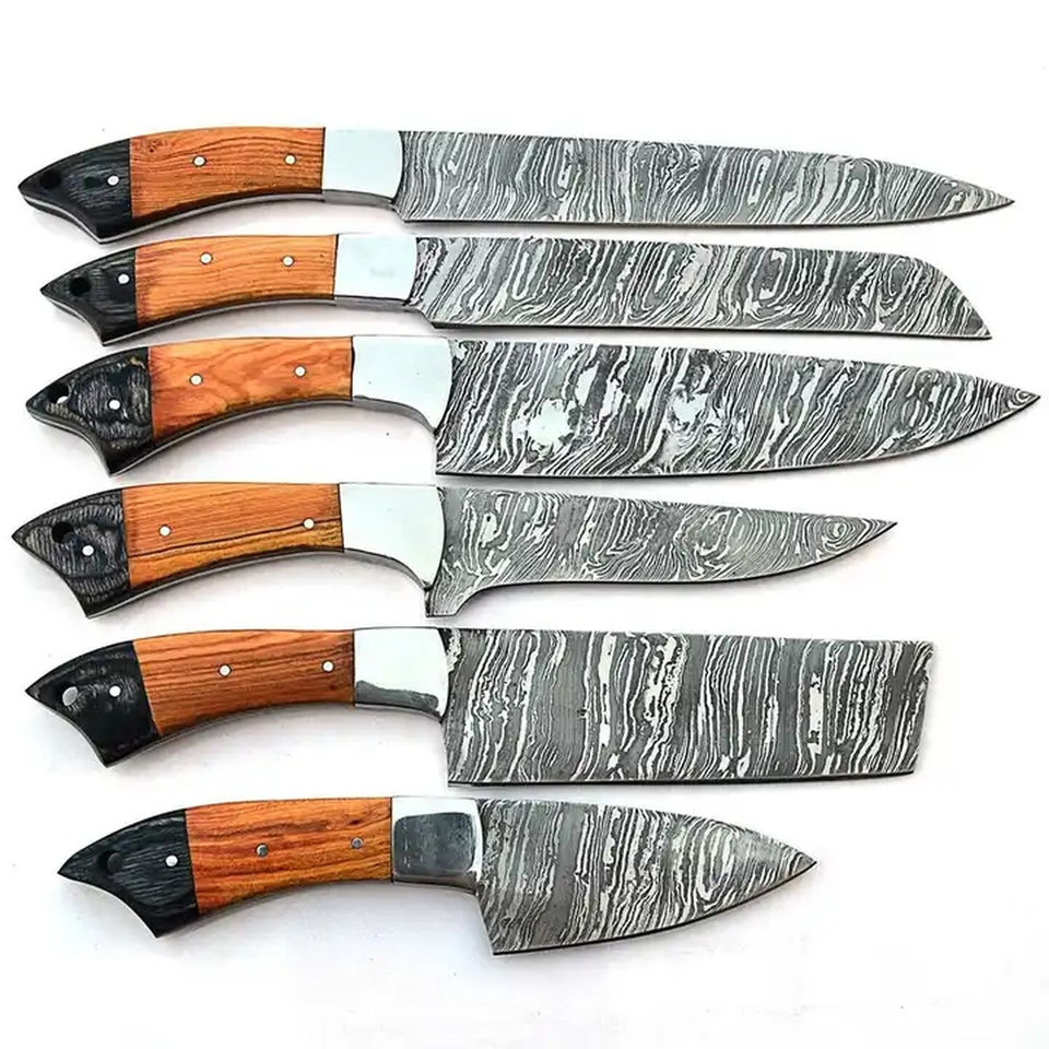 ชุดมีดเชฟเหล็กดามัสกัสทำมือแบบมืออาชีพ Burraq 6 ชิ้น ด้ามไม้ เป็นมิตรกับสิ่งแวดล้อม ใช้กับเครื่องล้างจานได้ ใช้งานได้ทั้งมือซ้ายและขวา
