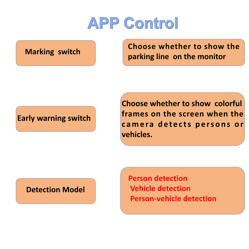 กันน้ำ, NIGHT VIEW, ที่จอดรถสาย, APP control, Can be used without monitor, can change detection objection via phoneฟังก์ชัน