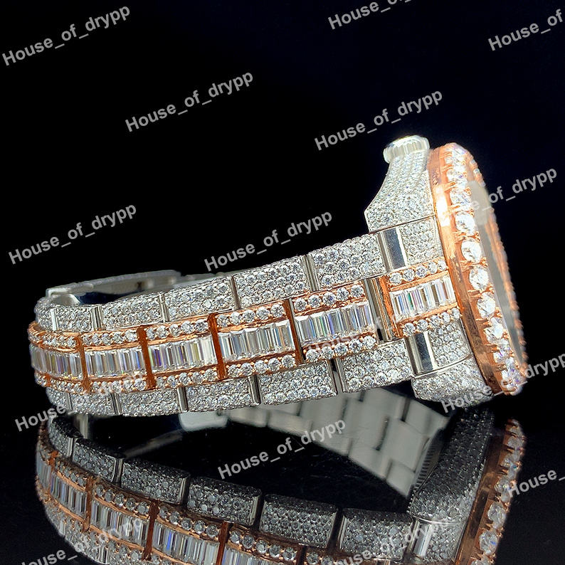 นาฬิกาแฟชั่นธุรกิจประดับเพชรโมอิสซาไนต์ ตัวเรือนสแตนเลสสตีล หน้าปัดสองสี กระจกสีน้ำเงิน ขอบ GMT ประดับเพชรเต็มวง ดีไซน์สายแบบประดับเพชรเต็มเส้น