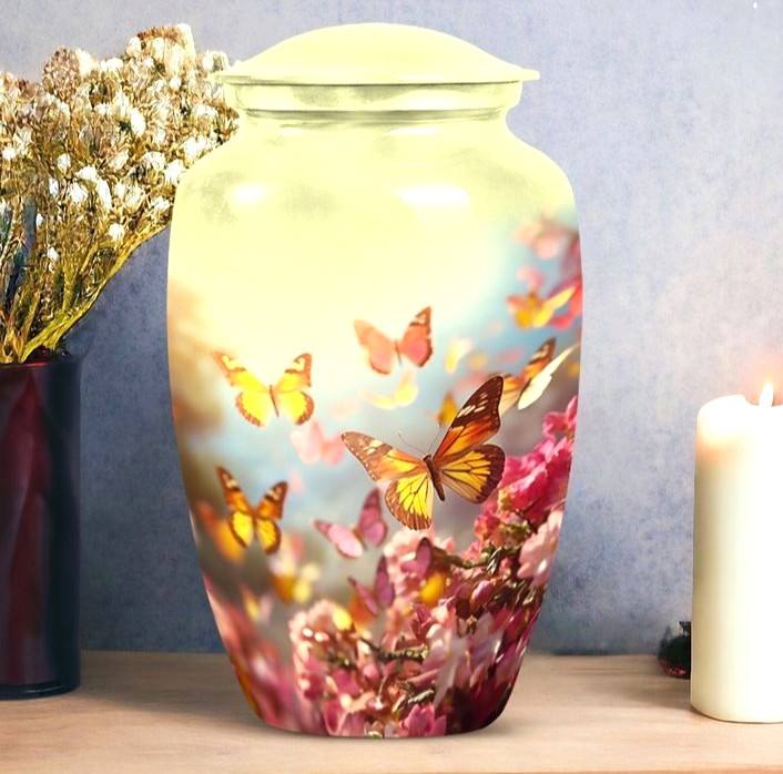 โกศบรรจุอัฐิอะลูมิเนียมรูปผีเสื้อ - สำหรับบรรจุอัฐิมนุษย์ผู้ใหญ่ - ขนาด 10 นิ้ว ลายดอกไม้ทำมือ สำหรับบูชาและระลึกถึง