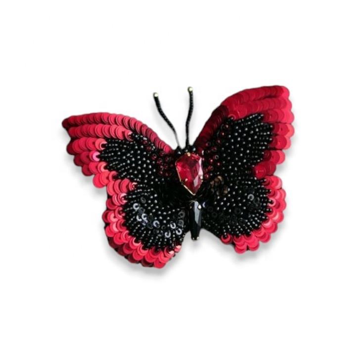 เข็มกลัดผีเสื้อสีดำและสีแดงพร้อมคริสตัลและไข่มุกปักด้วยมือและเข็มกลัดลูกปัดทอง