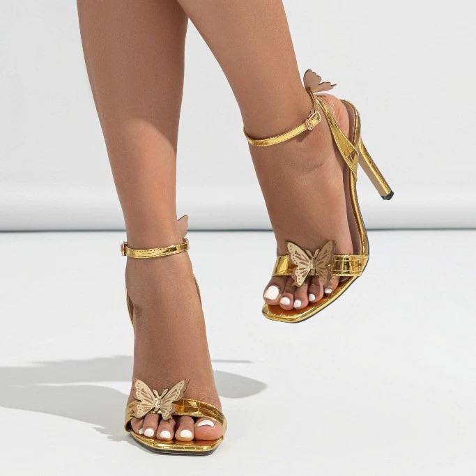 รองเท้าแตะส้นเข็มของผู้หญิงสายรัดข้อเท้าประดับผีเสื้อนิ้วเท้าสี่เหลี่ยม