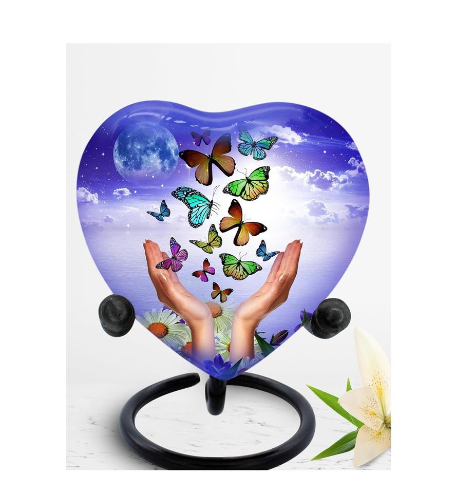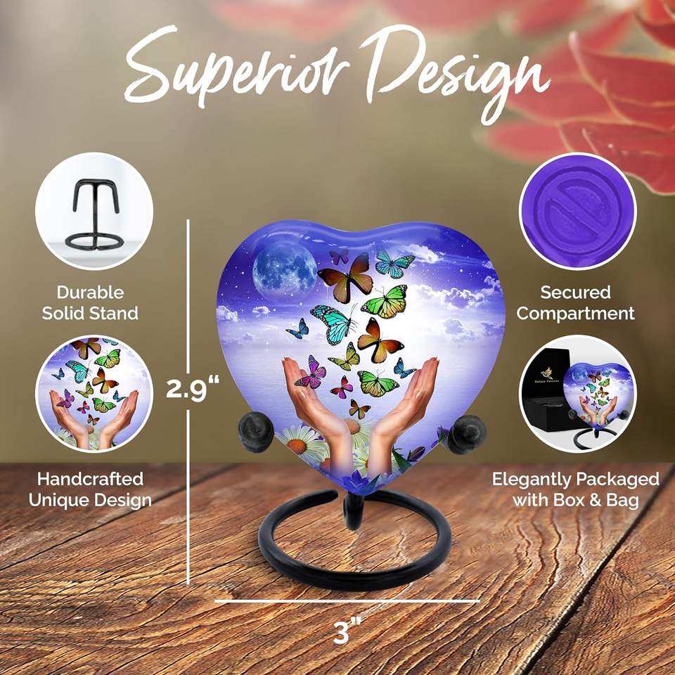 โกศรูปหัวใจผีเสื้อสําหรับเถ้ามนุษย์ - โกศผีเสื้อสีม่วงสําหรับเถ้าพร้อมกล่องและถุง - โกศสีม่วงขนาดเล็กพร้อมผีเสื้อ