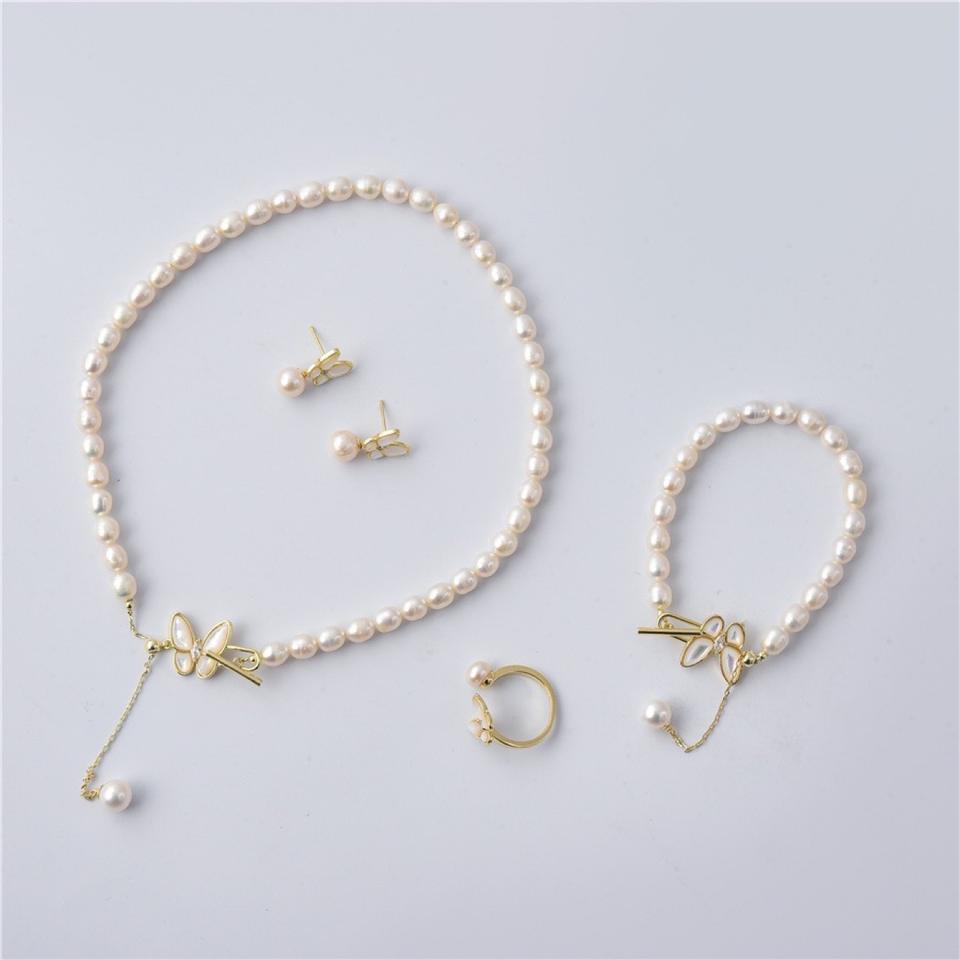 ชุดเครื่องประดับผีเสื้อแห่งความรัก ประกอบด้วยสร้อยคอมุกน้ำจืด สร้อยข้อมือ ต่างหูเงินแท้ แหวนเปิด-เครื่องประดับอเนกประสงค์