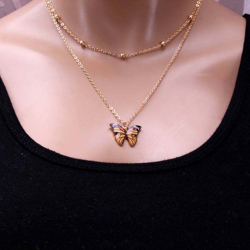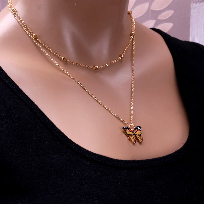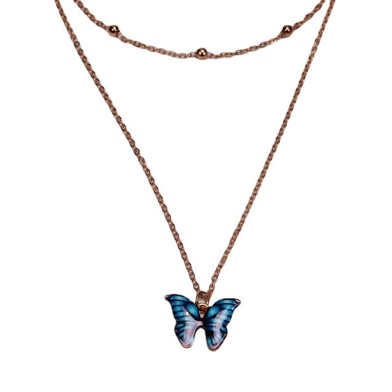 สร้อยคอจี้รูปผีเสื้อ ดีไซน์แบบมีชั้นๆ โซ่ทอง สำหรับผู้หญิง สวมใส่ได้ทุกวัน จี้รูปทรงเรขาคณิต จี้สีฟ้า