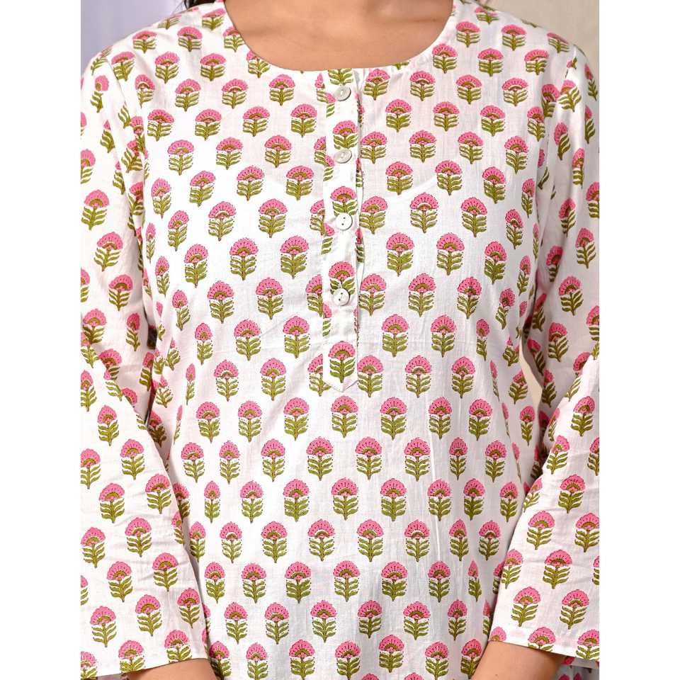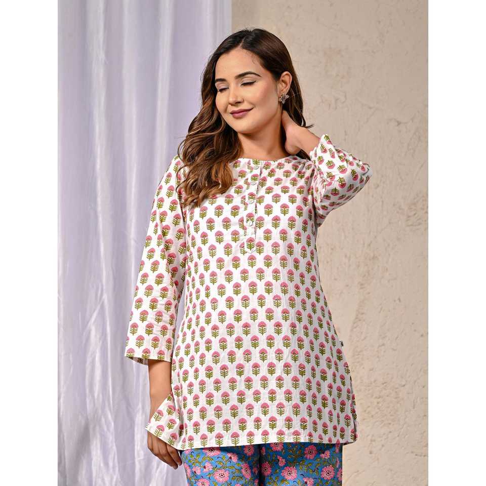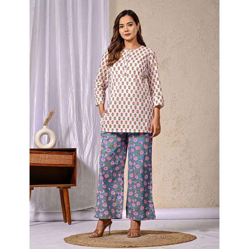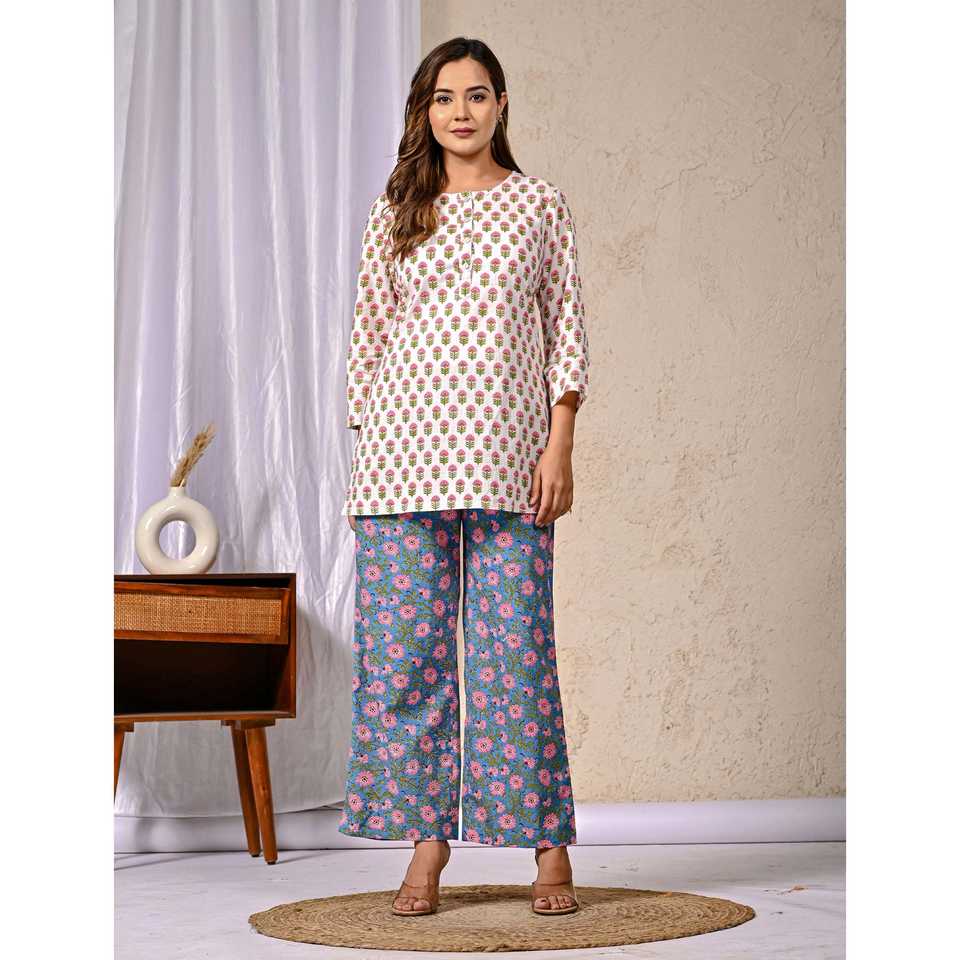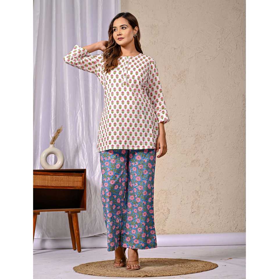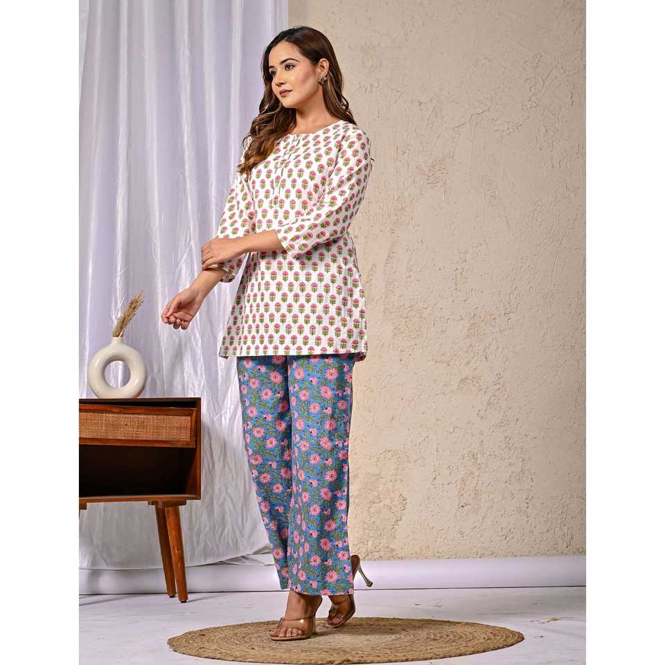 ชุดเซ็ตผ้าฝ้ายพิมพ์ลายบุตติ สีขาวน้ำเงิน ชุดเซ็ต 2 ชิ้น กางเกงขาสั้น แขนสามส่วน ชุดลำลองสำหรับใส่ในฤดูใบไม้ร่วงและฤดูร้อน ไซส์ XS XXS
