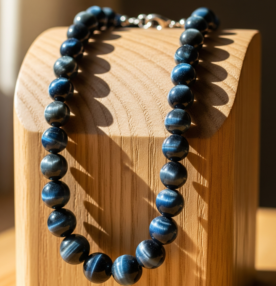 Buy Blue Tiger Eye Beaded Necklace for Women 18-Inch Silver 925 Lock Hand Knotted Geometric Design Trendy Fashion Accessory Gift