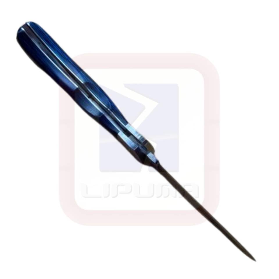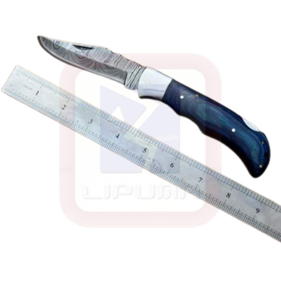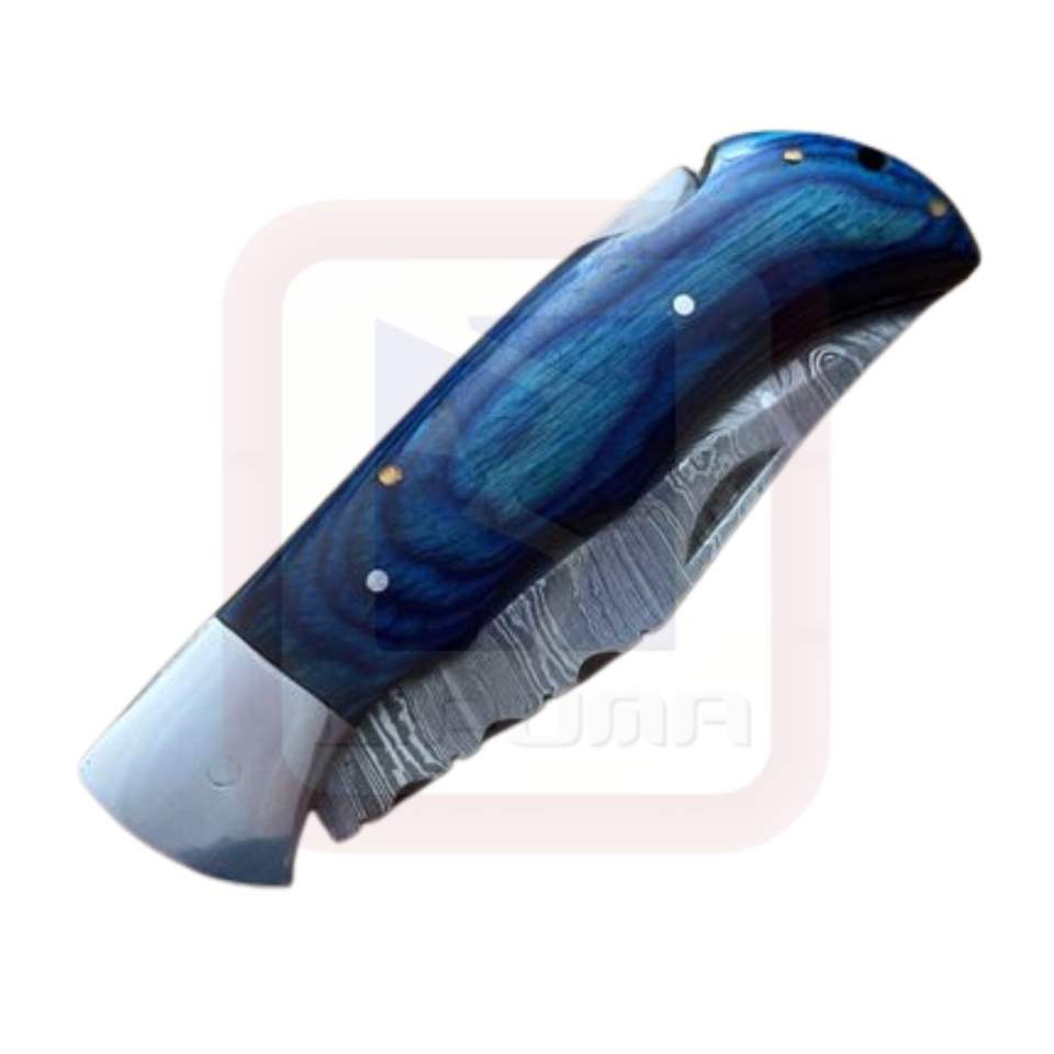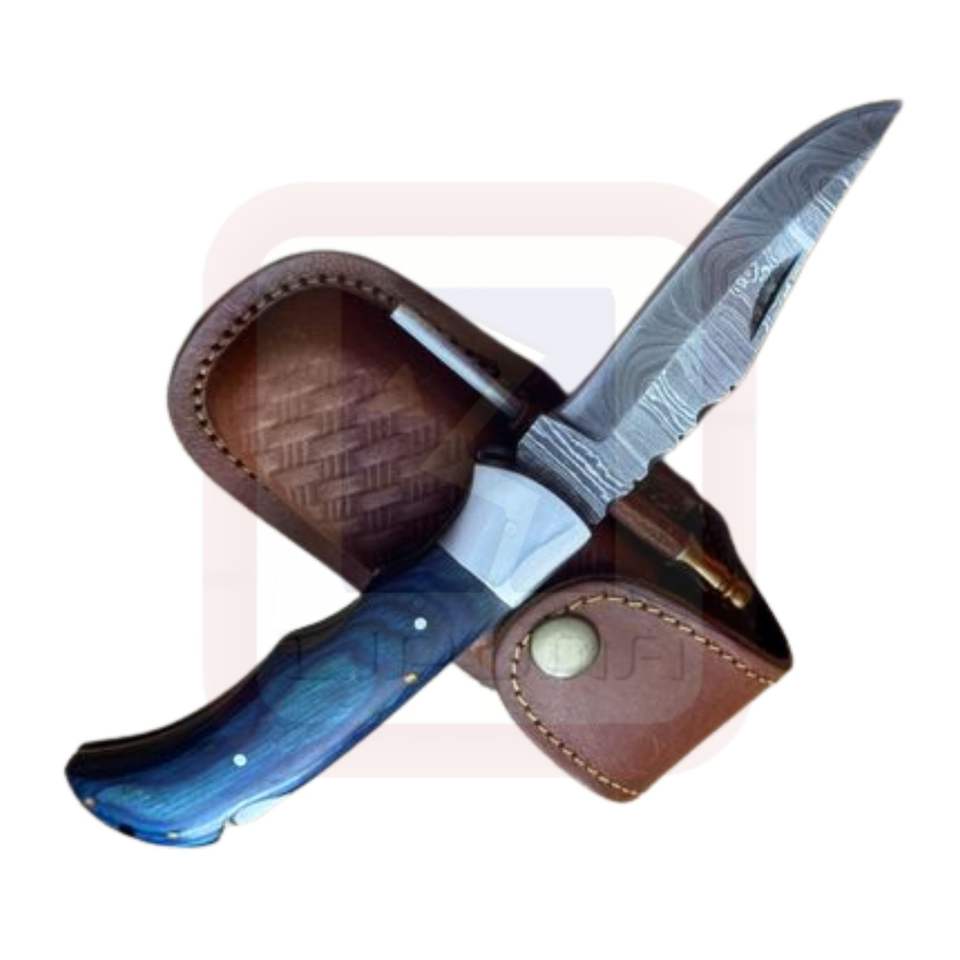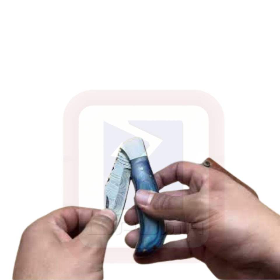 ซื้อมีดพับดามัสกัสแบบแฮนด์เมดหูหิ้วกระดูกสีฟ้าปลอกหนังมีดยุทธวิธีใช้กลางแจ้ง