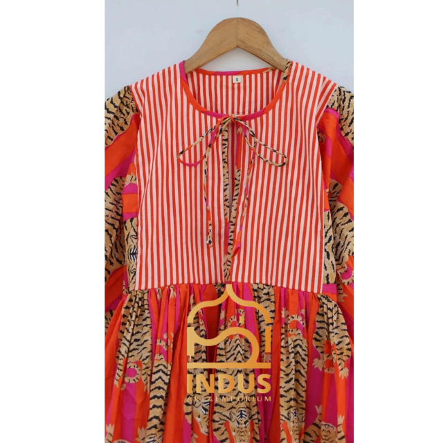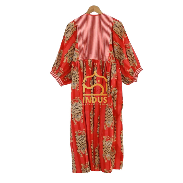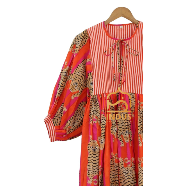 Jaipuri เดรสแขนมนสำหรับฤดูร้อนเดรสผ้าฝ้ายพิมพ์ลายแขนสิงโต