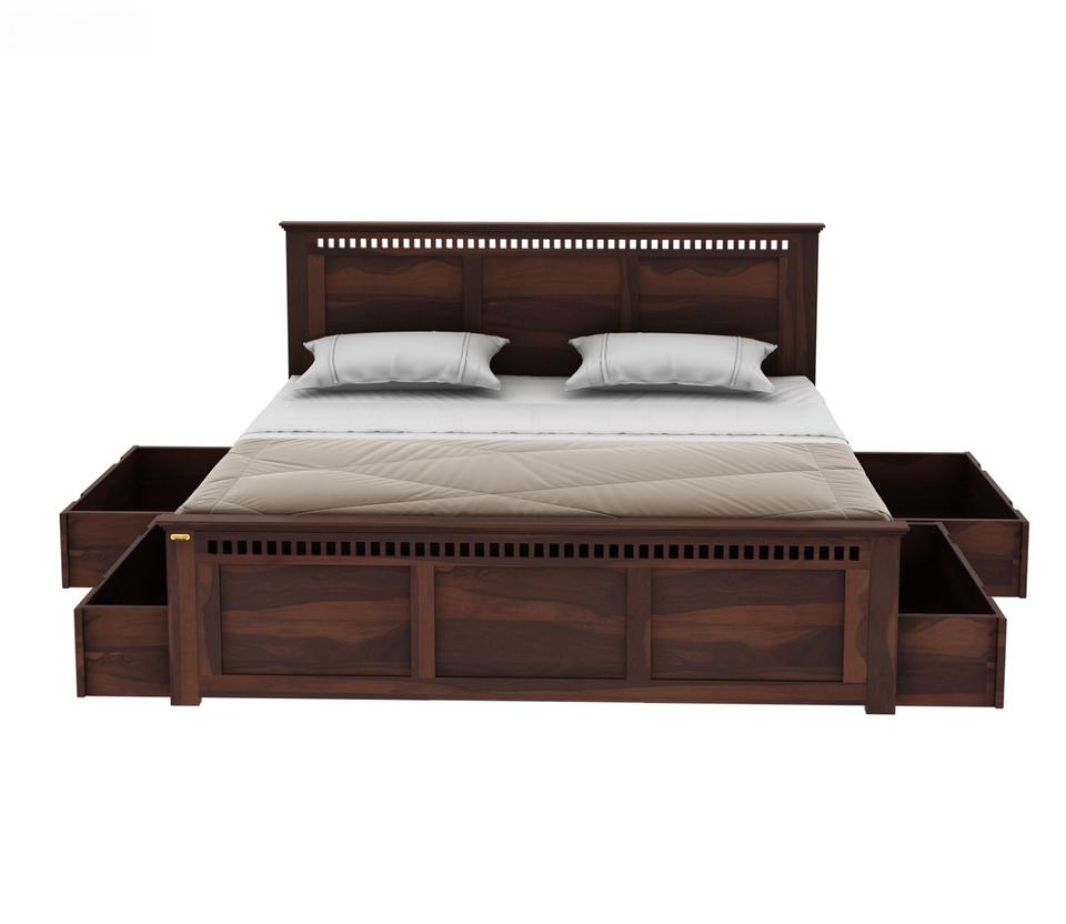 ซื้อเตียงไม้ชีแชมราคาขายส่ง พร้อมที่เก็บของด้านข้าง ขนาดคิงไซส์ สีวอลนัท เตียงไม้เนื้อแข็งดีไซน์หรูหรา พร้อมงานศิลปะ