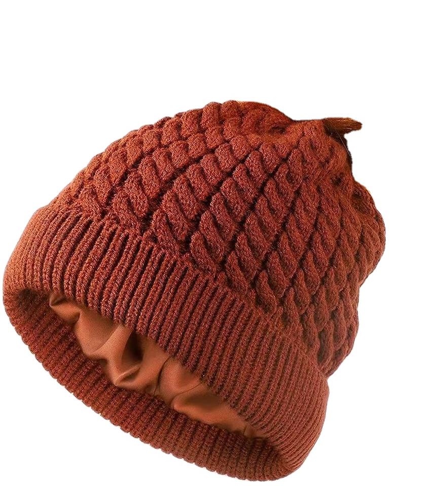 หมวกบีนนี่สำหรับผู้หญิงหมวกบีนนี่บุด้วยผ้าซาตินซับในหมวกขนสัตว์เทียมสำหรับฤดูหนาวหมวกถักให้ความอบอุ่น2025สำหรับผู้หญิง