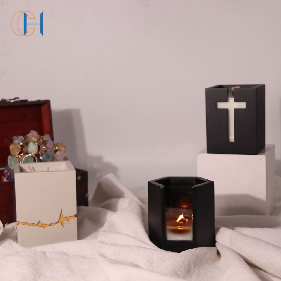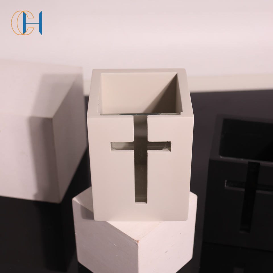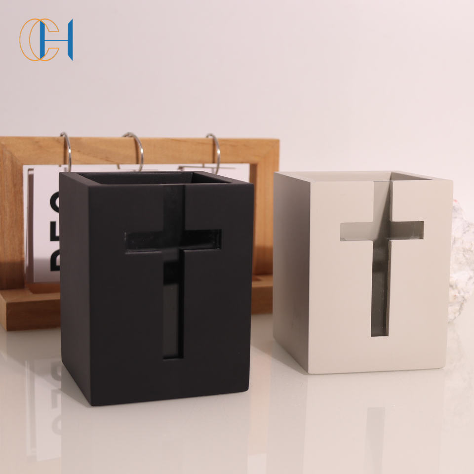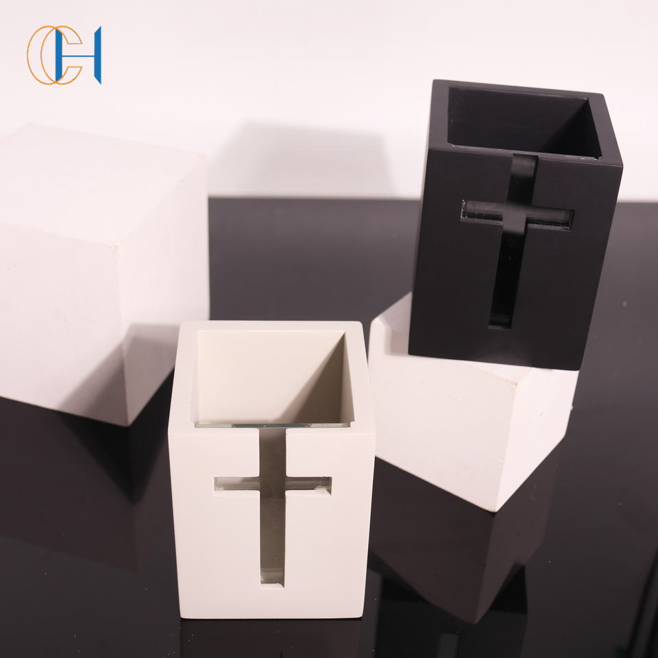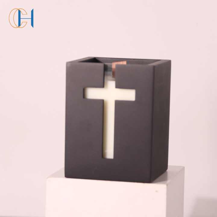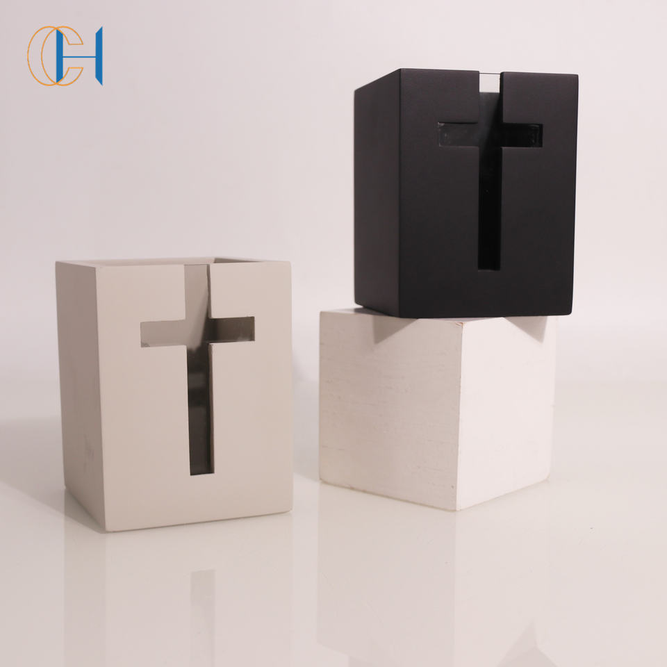โถเทียนทรงเหลี่ยมพร้อมไม้กางเขนทำจากซีเมนต์สีดำสีขาวมีเอกลักษณ์สไตล์นักบุญ