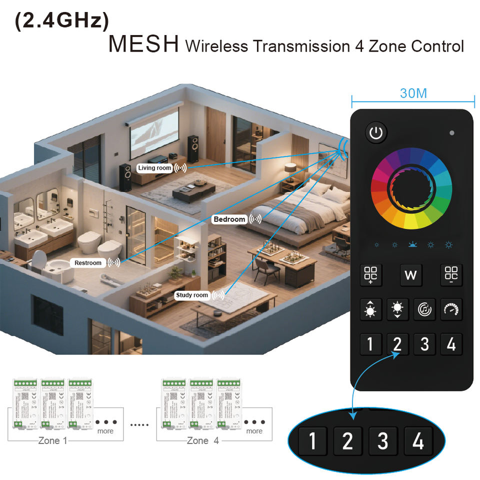 C100B รีโมตคอนโทรล Groupsync Tuya สมาร์ทมินิ12/24V เปลี่ยนสีได้ด้วยรีโมทคอนโทรล rgbwc 4โซน