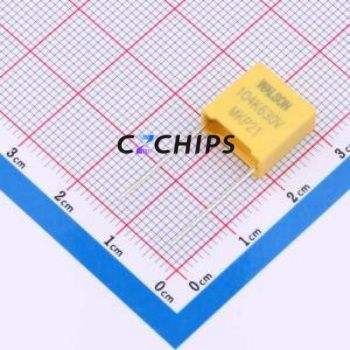 ตัวเก็บประจุฟิล์มโพลีโพรพิลีน (CBB) แบบมีรูทะลุ (THT) รุ่น C322J10458P40001, ระยะขา P=10 มม. ความจุ 100nF ค่าความคลาดเคลื่อน 10% แรงดัน 630V