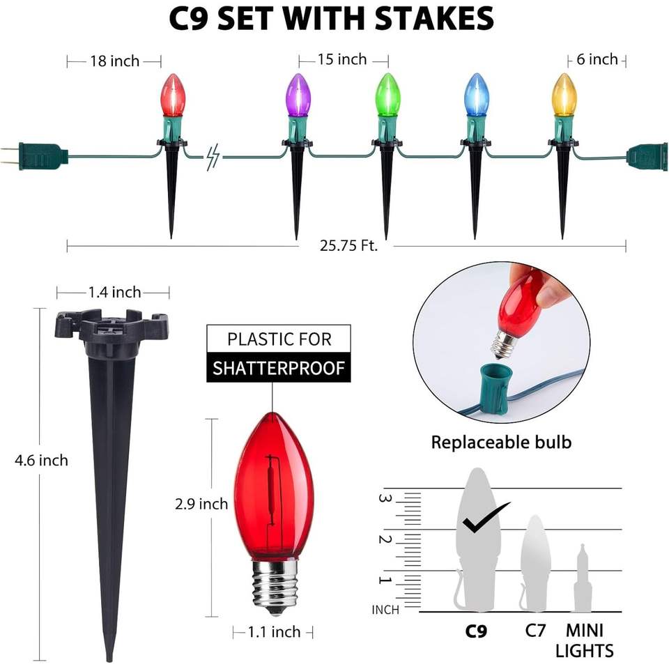 C9 Outdoor Christmas Multicolor String Lights 20 LED Pathway Lights with 20 Stakes 25.7 Feet Waterproof Connectable 100m Length