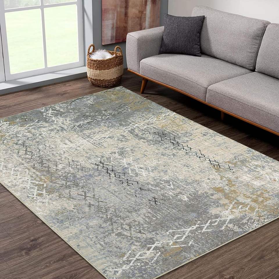พรมปูพื้นลายเรขาคณิตสีเบจ ขนาด 8x10 ฟุต ผลิตจากโพลีเอสเตอร์ ขนสั้น ไม่ลื่น สำหรับห้องนั่งเล่นและห้องรับประทานอาหาร รุ่นใหม่ล่าสุด ปี 2025