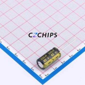 ตัวเก็บประจุอิเล็กโทรไลต์อะลูมิเนียมแบบ Through-Hole รุ่น CD26G1JM331G200T (THT), ขนาด D10xL20 มม. 330uF 20% 63V 5 มม.