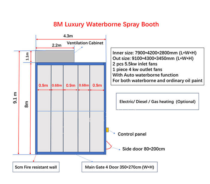 บูธพ่น5L cbp 05มีระบบทำความร้อนไฟฟ้าและระบบหัวเผาดีเซลสำหรับทาสีรถยนต์และอบด้วยไฟ LED