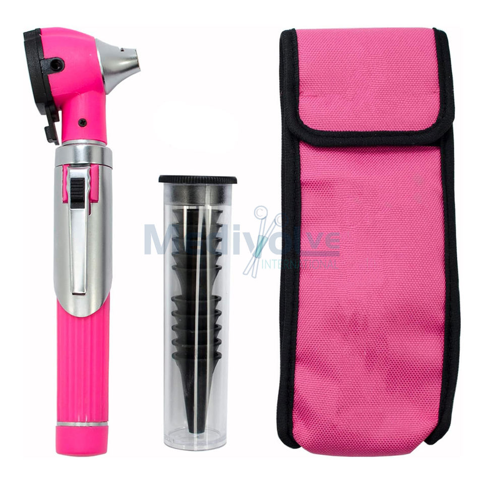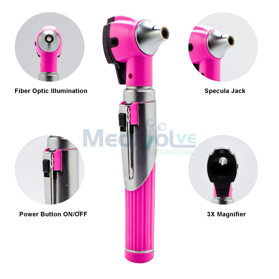เครื่องตรวจหูไฟเบอร์ออปติกไฟฟ้าขนาดเล็ก ได้รับการรับรองมาตรฐาน CE ผลิตจากสแตนเลส ขนาดกะทัดรัด ใช้ซ้ำได้ สำหรับการวินิจฉัยทางหู คอ จมูก สีชมพู รับผลิตแบบ OEM และติดฉลากสินค้าส่วนตัว