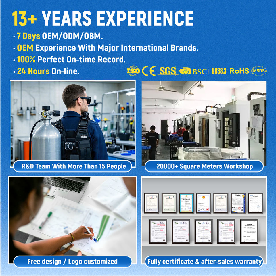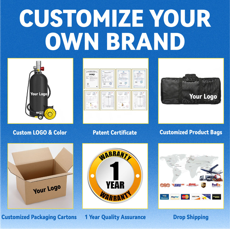 ถังอากาศอลูมิเนียมคุณภาพสูง 2 ลิตร ได้รับการรับรองมาตรฐาน CE DOT สำหรับดำน้ำด้วยออกซิเจนอัดแรงดัน 200 บาร์ ใช้ได้นาน 30-40 นาที พร้อมโลโก้ตามสั่ง